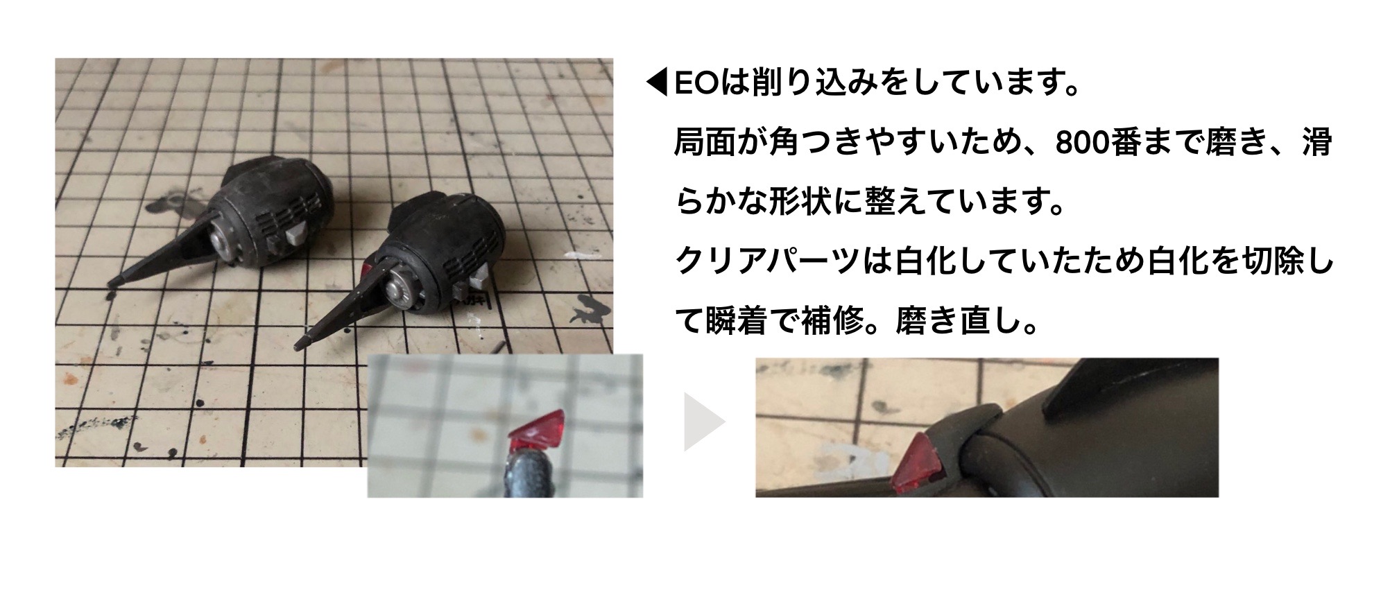 クリアーパーツは白化していたため、補修してます。白化部分を除去し、瞬着で肉盛り後に削り込み。最後に磨いてます。
