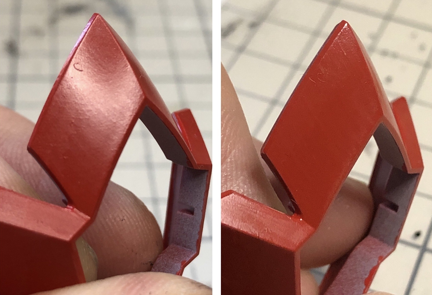 ▲ガンプラなどではよくムラになりがちな赤。ゴワゴワして筆跡も出ているものがここまで落ち着きます。