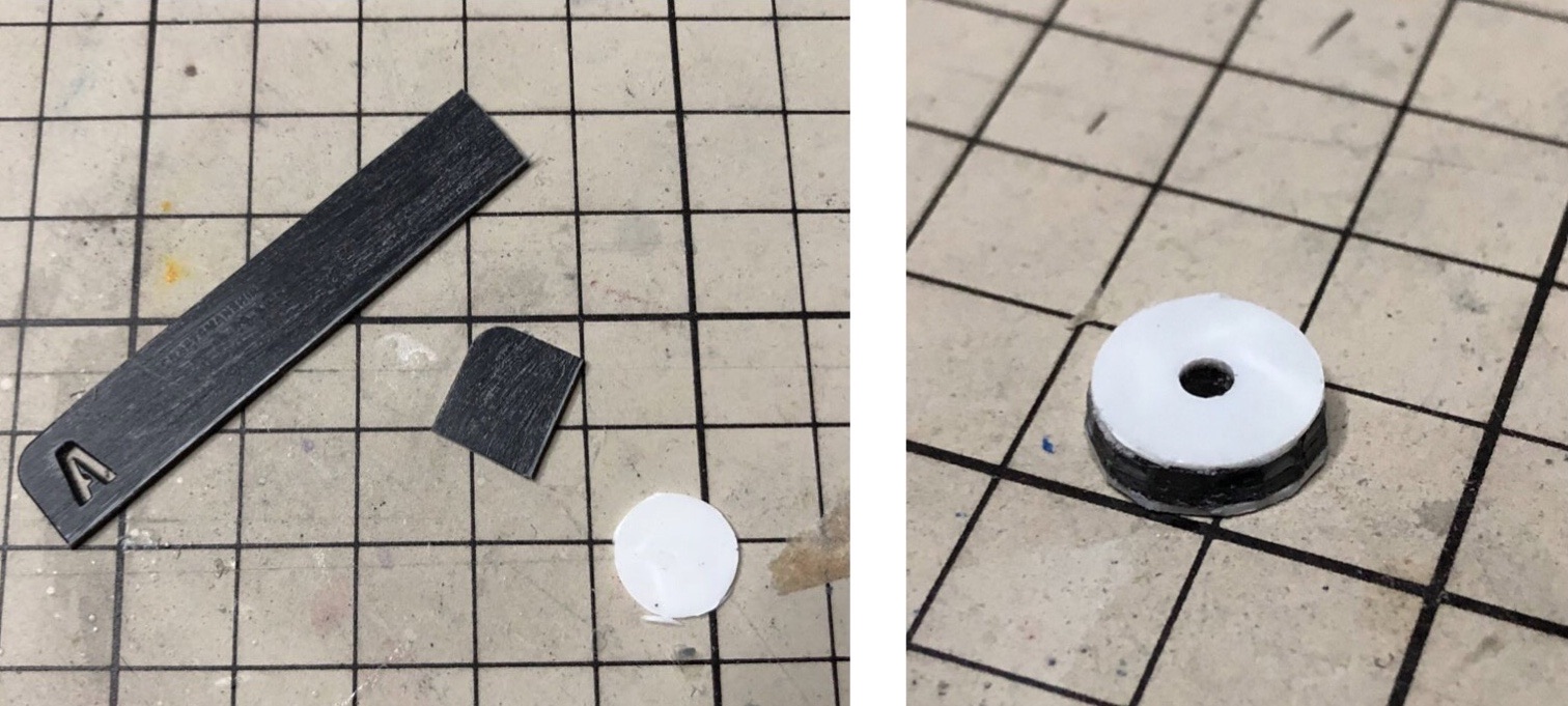 その際に、中心から1番外側の面をそれぞれ少し削り、平面にして細切りプラ板を貼り付けます。