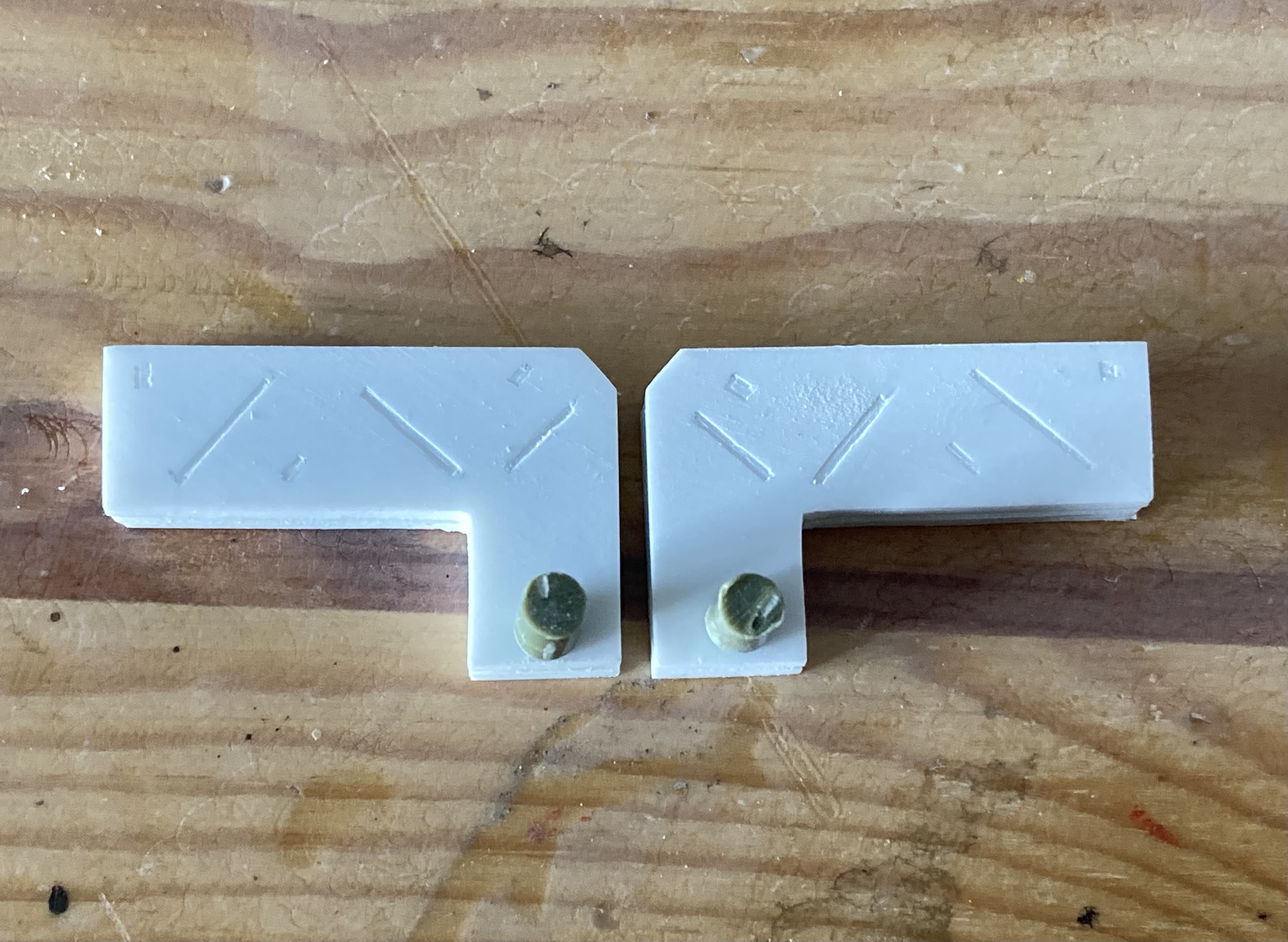 写真では一ヶ所ですが、それだけではなく、さまざまな面で仮止め接着と削り込みをすることにより左右の形状の誤差が最小限になります。