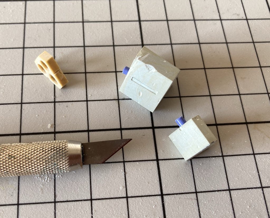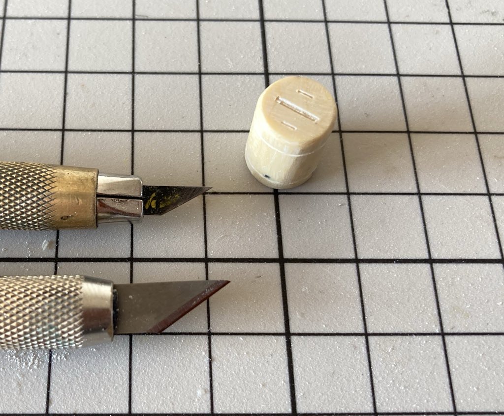 バレルの留め具や、あちこちある凹みモールドはデザインナイフや30°カッターのお尻を削って作った自作ノミを使用してます。