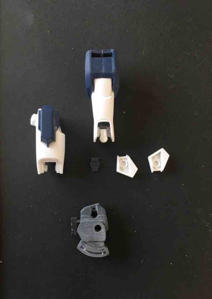 太ももは大きい合わせ目があるのでそこを消しました。接着するとそのままではヒザ関節がつけられなくなるため、ピンを短くし、ヒザ関節フレームを一部削ることであとハメ加工できるようにしています。